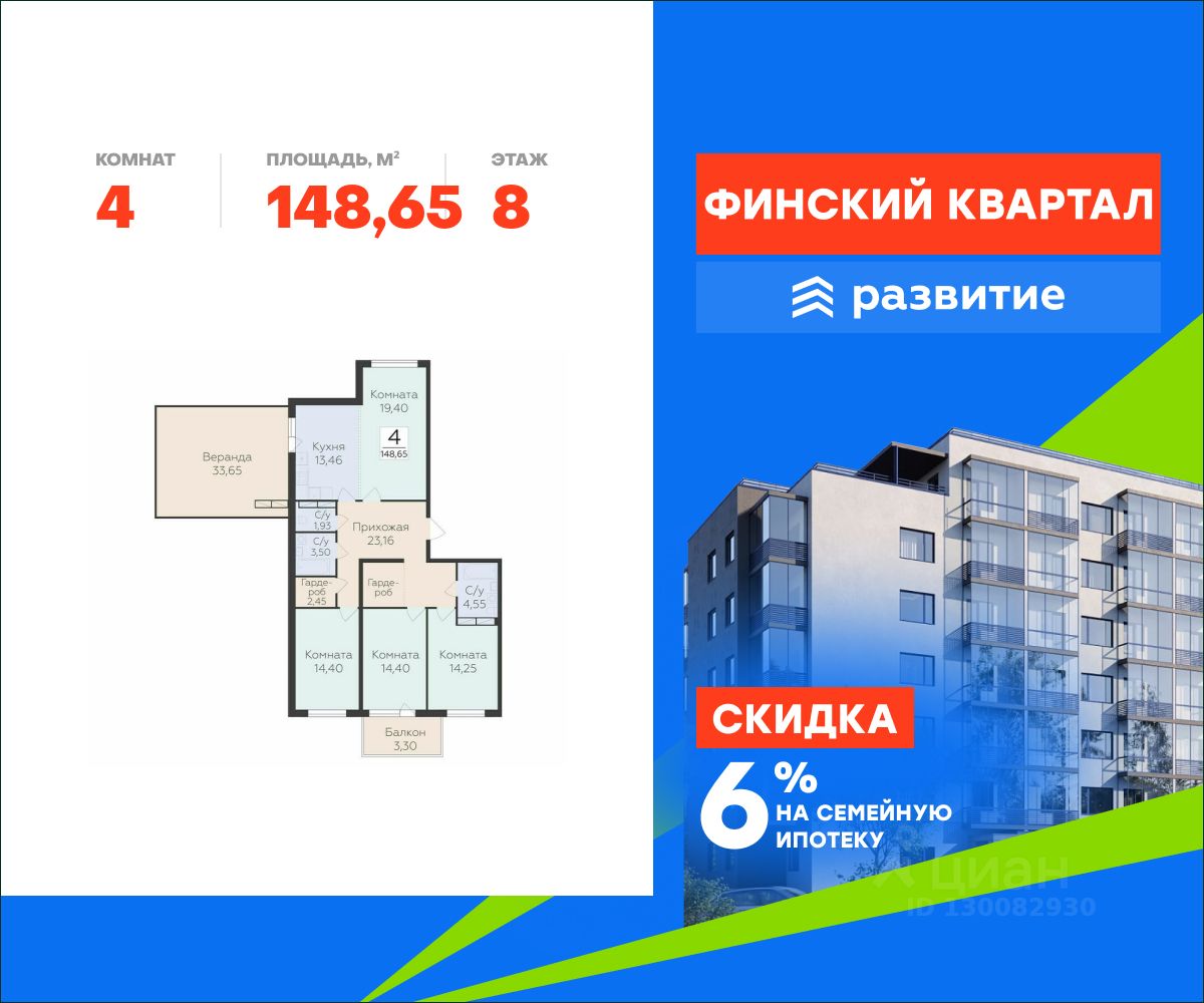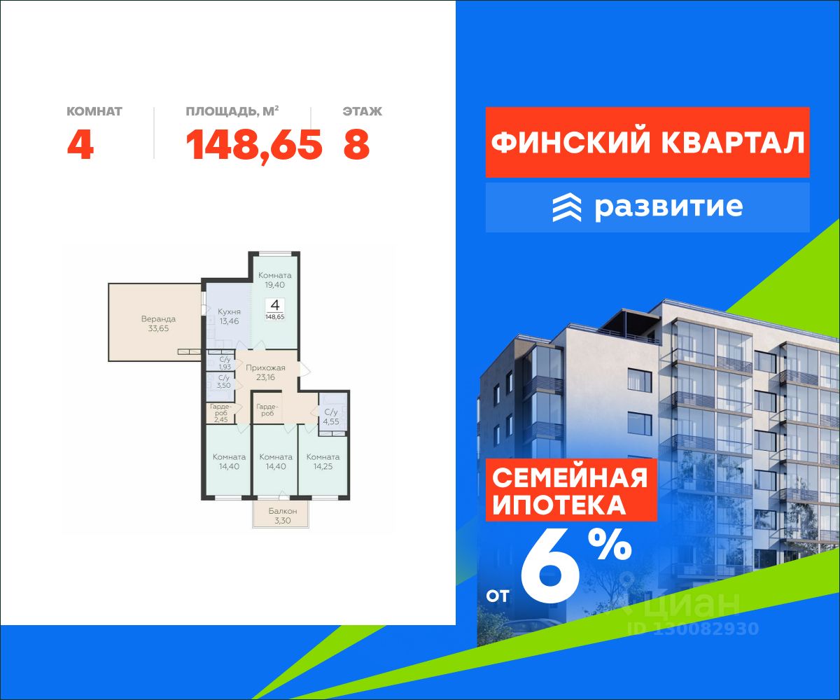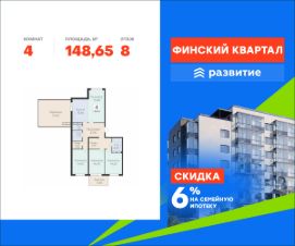 Продается квартира площадью 148.65 кв. м с отделкой white box. Квартира расположена на 8 этаже 8 этажного дома, в жилом комплексе комфорт-класса "Финский Квартал".