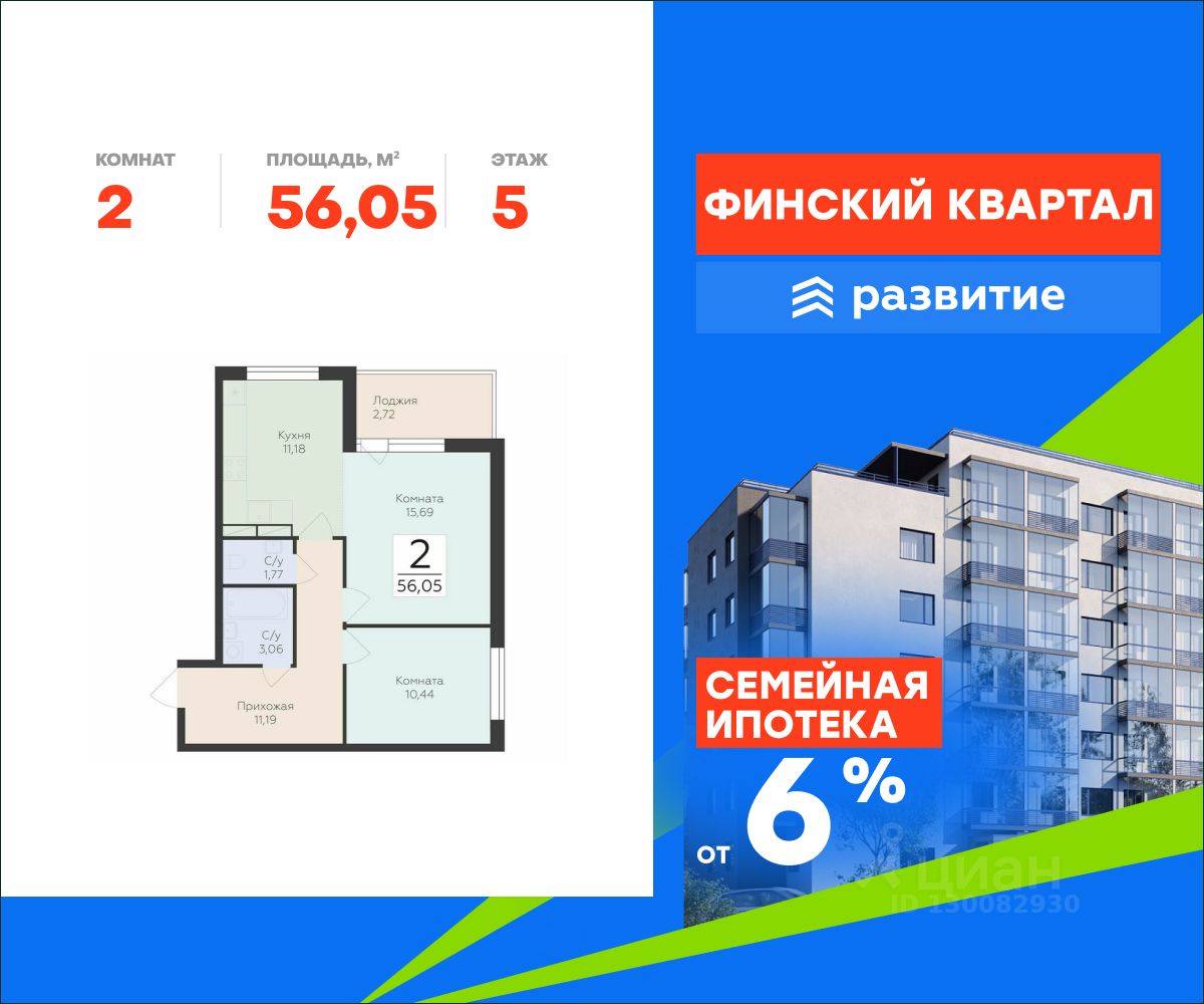 Продается квартира площадью 56.05 кв. м с отделкой white box. Квартира расположена на 5 этаже 8 этажного дома, в жилом комплексе комфорт-класса "Финский Квартал".