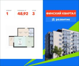 Продается квартира площадью 48.92 кв. м с отделкой white box. Квартира расположена на 3 этаже 7 этажного дома, в жилом комплексе комфорт-класса "Финский Квартал".
