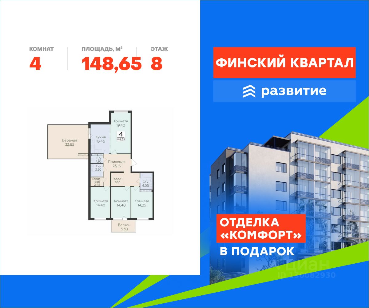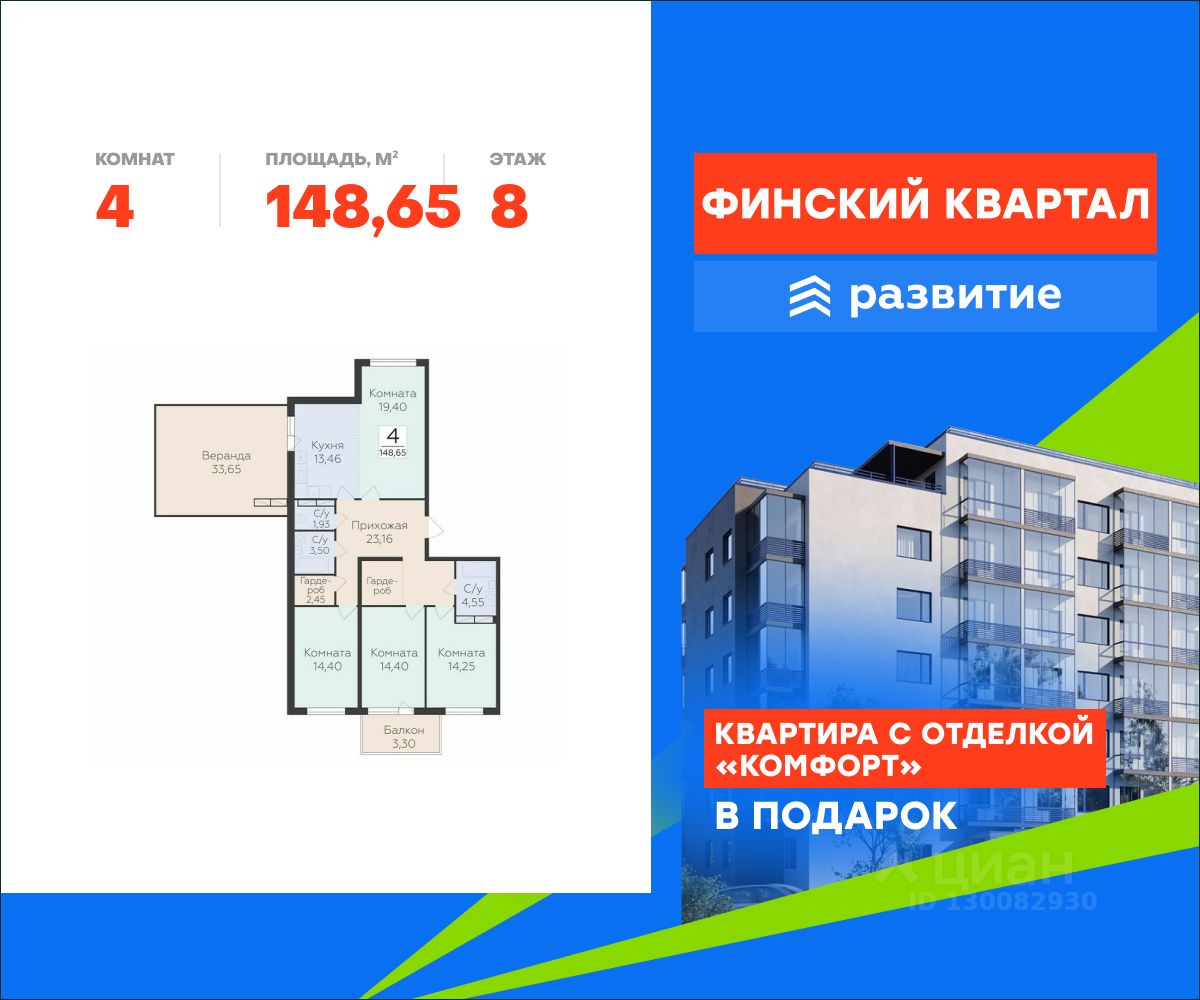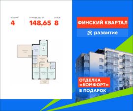 Продается квартира площадью 148.65 кв. м с отделкой. Квартира расположена на 8 этаже 8 этажного дома, в жилом комплексе комфорт-класса "Финский Квартал".