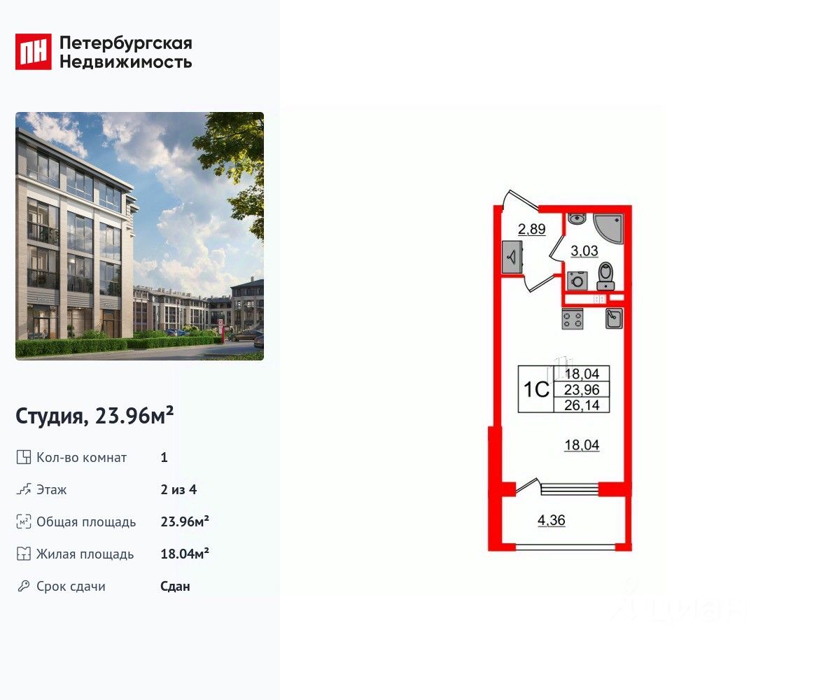 Удобная, классическая, функциональная европланировка, вместительная прихожая 2.89 м². Общая площадь студии - 23.96 м², жилая 18.04 м², высота потолка 2.77 м.