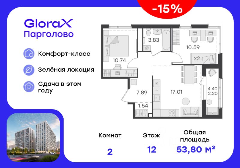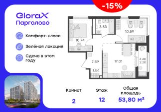 Продается 2-комн. квартира на 12-м этаже в проекте комфорт-класса GloraX Парголово. Общая площадь лота составляет 53,80 кв. м, из которых 21,33 кв. м отведено под жилую и 17,01 кв. м под кухонную зону. Номер квартиры - 144.