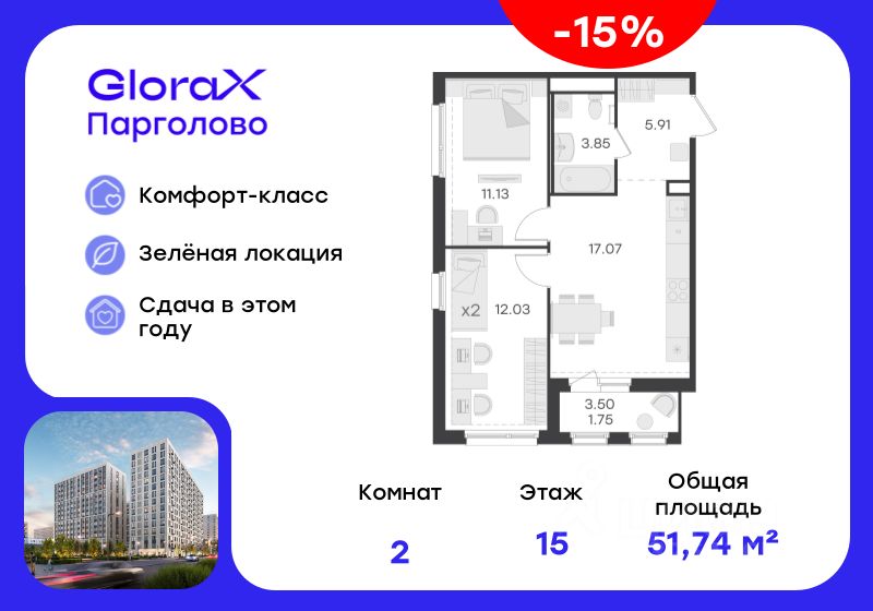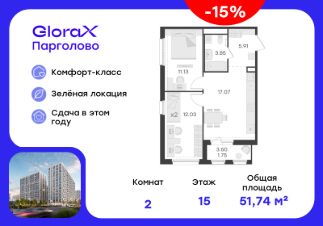 Продается 2-комн. квартира на 15-м этаже в проекте комфорт-класса GloraX Парголово. Общая площадь лота составляет 51,74 кв. м, из которых 23,16 кв. м отведено под жилую и 17,07 кв. м под кухонную зону. Номер квартиры - 275.