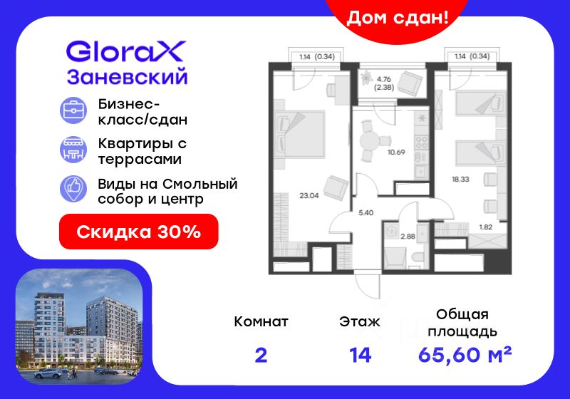 Продается 2-комн. квартира на 14-м этаже в проекте бизнес-класса GloraX Заневский. Общая площадь лота составляет 65,22 кв. м, из которых 41,37 кв. м отведено под жилую и 10,69 кв. м под кухонную зону. Номер квартиры - 491.