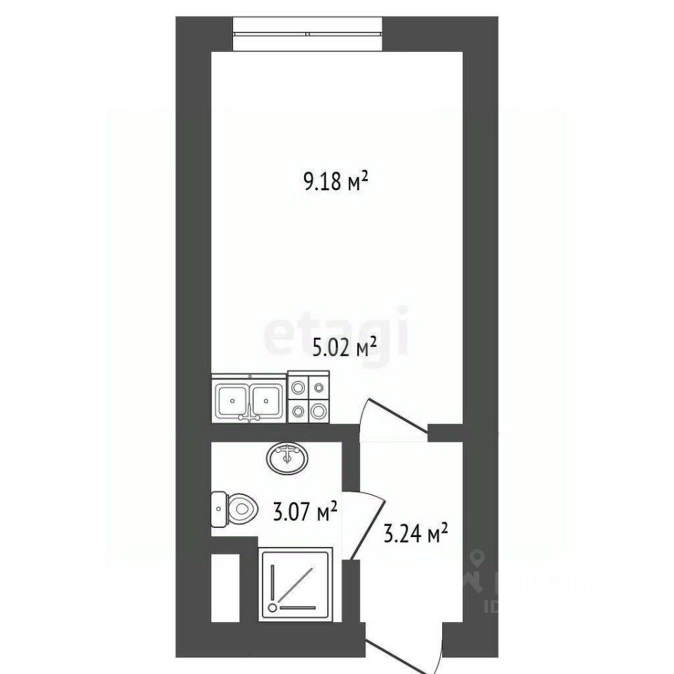 Окна выходят во двор и частично на акваторию Финского залива, обеспечивая естественное освещение и приятный вид. Планировка включает жилую комнату 9,18 кв. м., кухню-нишу 5,02 кв. м., санузел 3,07 кв. м. и прихожую 3,24 кв. м. — компактное, но функциональное пространство, подходящее для одного человека или пары.