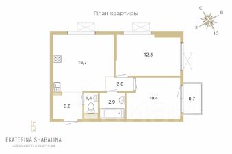 О КВАРТИРЕ: Сама квартира располагается на 6-м этаже. Очень удачная планировка: две изолированные комнаты 12,8 и 10,4 кв.м, раздельный санузел и большая эргономичная кухня - 16,7 кв.м.