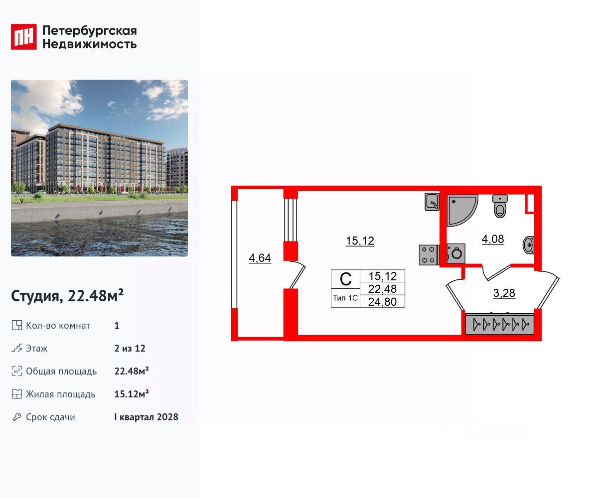 Удобная, классическая, функциональная европланировка, просторная прихожая 3.28 м². Общая площадь студии - 22.48 м², жилая 15.12 м², высота потолка 2.77 м.