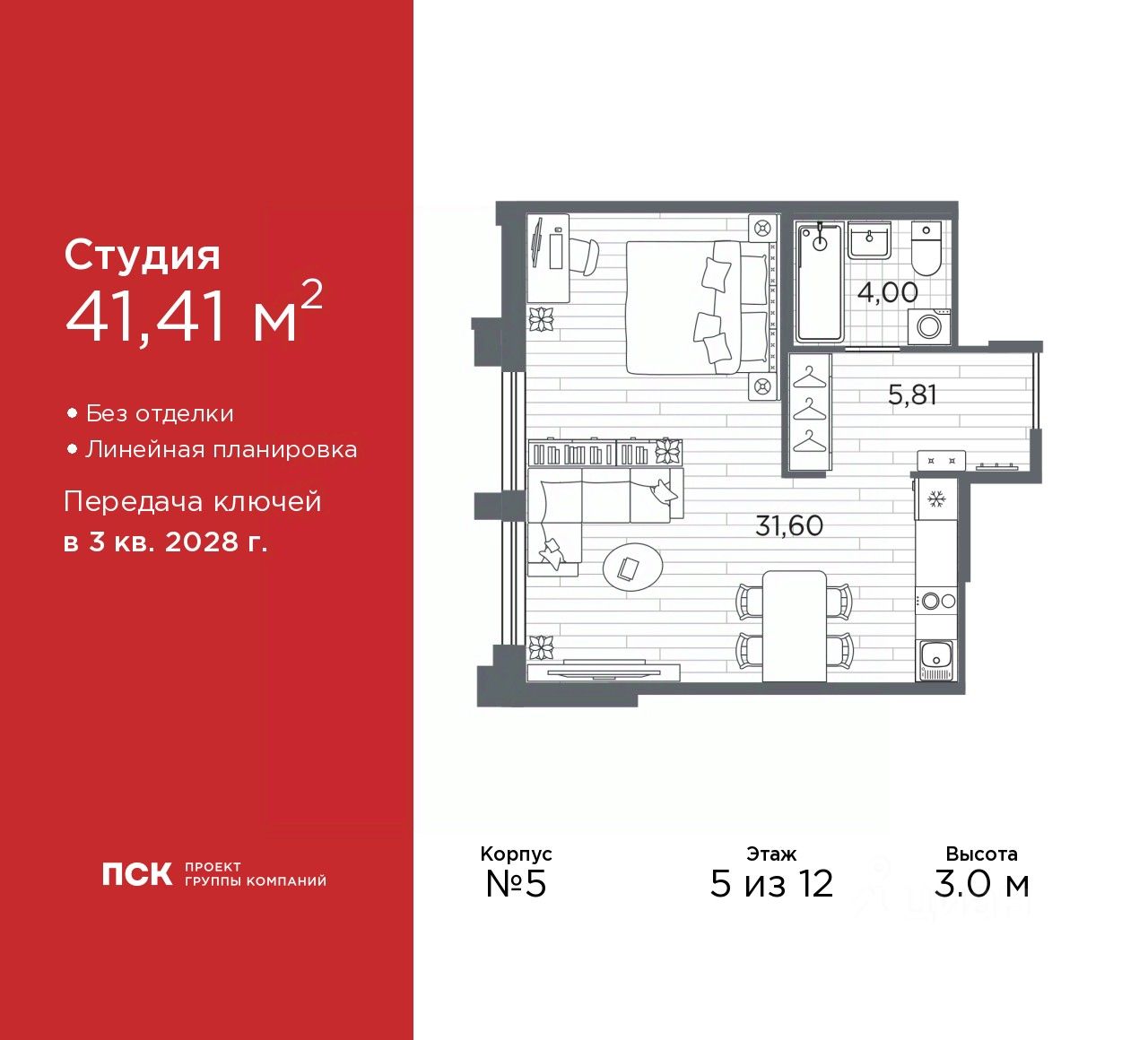 Однокомнатная квартира-студия в Клубный квартал "Ассамблея" на 5 этаже. Квартира без отделки, после оформления собственности можно делать ремонт. Общая площадь: 41.41 кв.м., площадь гостиной 31.6 кв.м., из которых 10 кв.м. выделено под кухонную зону. Все окна выходят на одну сторону. В квартире один совмещенный санузел. Высота потолков 3.0 м.