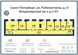 Площадь: 100,3 м² | Этаж: 5/5 | 6 комнат + кухня | Потолки 2,7 м