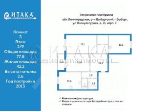 1-92079 Продаётся уютная трехкомнатная квартира площадью 77.8 квадратных метров на втором этаже девятиэтажного панельного дома, расположенного по адресу: г.Выборг, Центральный микрорайон, ул.Физкультурная, дом 21 к2. Строение 2013 года обладает современной инфраструктурой: в шаговой доступности находятся школа, детский сад, торговый центр, парк и фитнес-клуб.