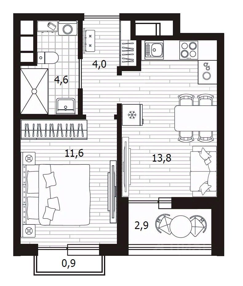 Современное зонирование: кухня-гостиная 13,8 м², спальня 11,6 м², просторная прихожая и гардеробная. Санузел 4 м², лоджия — 2,9 м².