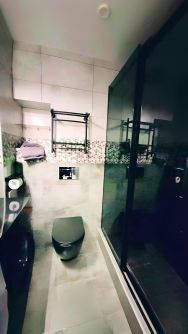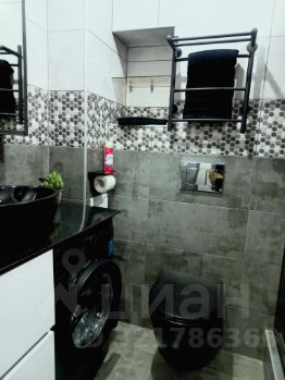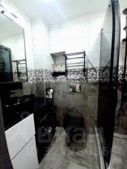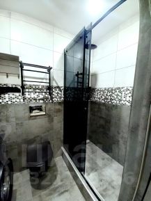 В санузле качественный керамогранит и стильная душевая перегородка из тонированного стекла с матовой фурнитурой в тон сантехнике и стиральной машине.