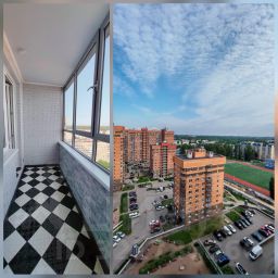 Светлая квартира с большим балконом, на котором можно сделать уютную лаунж-зону или рабочий кабинет (освещение выведено).