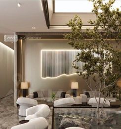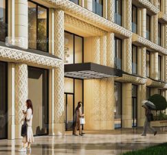 Квартира с эргономичной и правильной планировкой, которая включает в себя две спальни (20м2+14м2) и кухню-гостиную 52м2, гардеробных, трёх сан узлов, трёх, один из которых с панорамным окном.