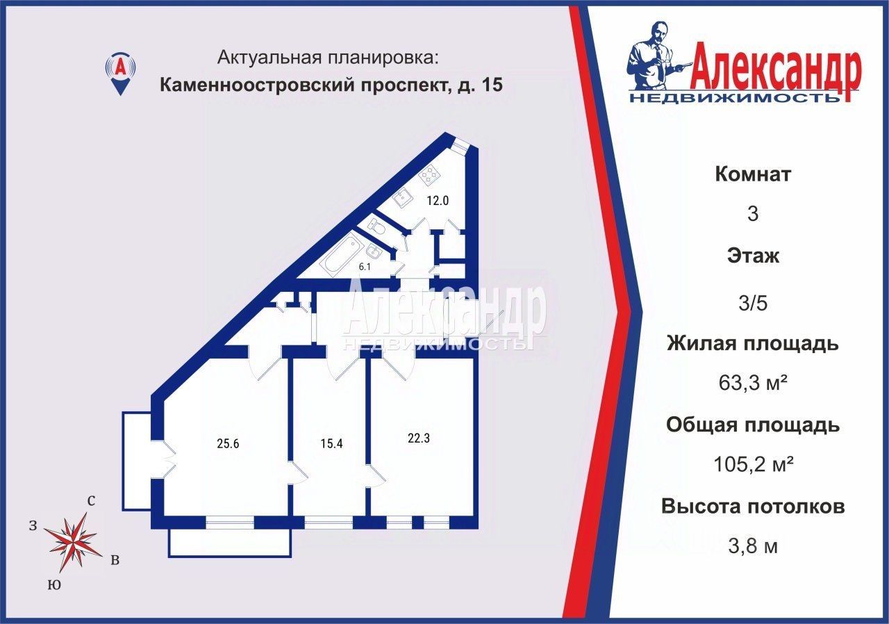 1703410 В Историческом центре Санкт-Петербурга, на Австрийской площади в доме построенном в 1952 году, в стиле Советский неоклассицизм , в 5 минутах от метро Горьковская, рядом с достопримечательностями Санкт-Петербурга как Ленинградский зоопарк, Петропавловская крепость, множество музеев, парков, театров и т.д. Предлагается к продаже трех комнатная квартира 105.2 кв. м. Окна большой просторной гостиной с балконом выходят на Австрийскую площадь, все комнаты изолированные -25,6 кв.м, 22,3 кв.м, 15,4 кв.м, высота потолков 3,8 м, с/у раздельный, ванная 6,1 кв.м отделана кафелем с душевой кабиной, кухня 12 кв.м окно выходит во двор, большая прихожая 15 кв.м, две кладовки и два встроенных шкафа, квартира продается с мебелью. Рядом детский сад, Лицей 82, школы, магазины. ТЦ, рестораны, спорт клубы, бассейн. Во дворе сквер Виталия Мельникова, детская площадка, также имеется на огороженной парковке место для машины.