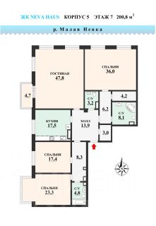 Это просторная Евро 5-к квартира площадью 195,2 квадратных метрав лучшем корпусе (5-ом) элитного жилого комплекса "Neva Haus", расположенная на 7 этаже. Из окон квартиры открывается захватывающий вид на водные просторы Малой Невки, Леонтьевский мыс и Крестовский остров, которые особенно великолепны в момент заката.