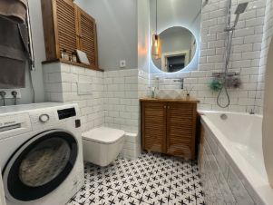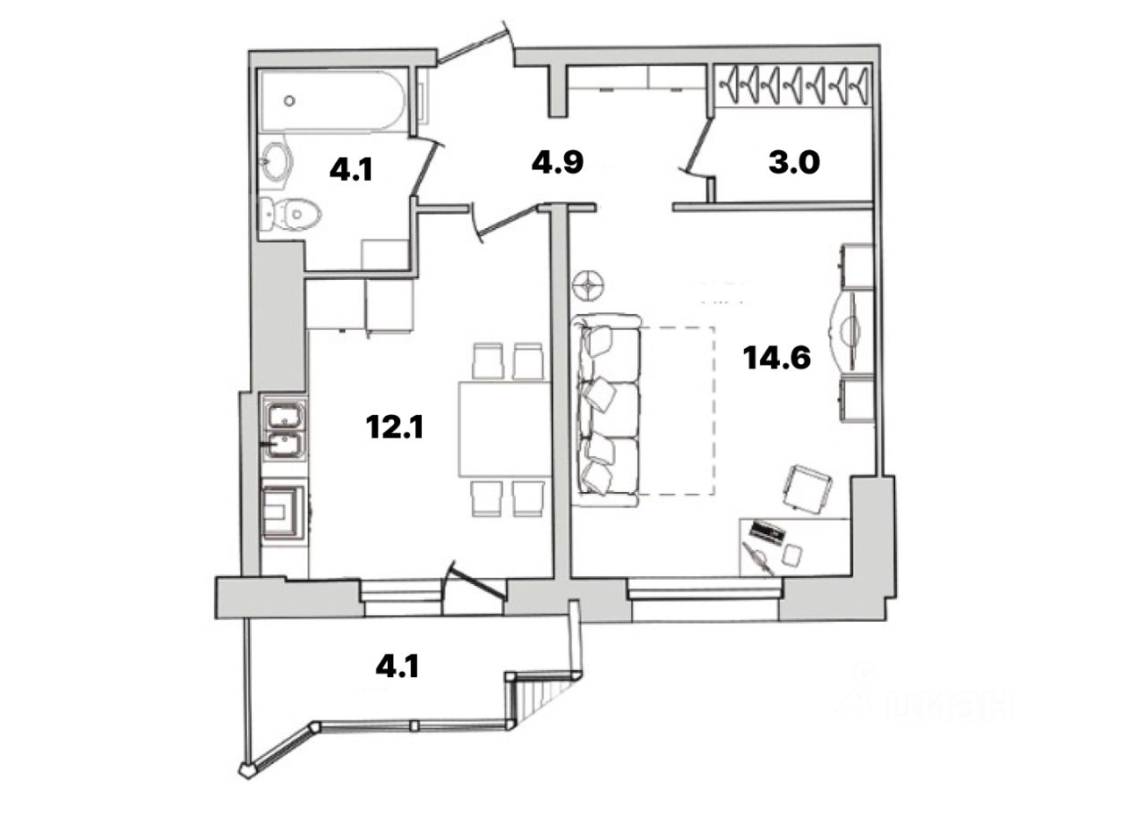 Кухня - столовая 12.1 кв.м. с остекленным балконом 4.1 кв.м. который станет дополнительным пространством для хранения вещей или отдыха. Жилая комната 14.6 кв.м. с возможностью разделения на гостевую, спальную зоны. Гардеробная 3.0 кв.м. Прихожая 4.9 кв.м. с местом под шкаф. Совмещённый санузел. Последний этаж - соседей сверху нет, на этаже три квартиры.