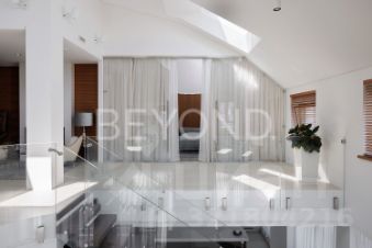 Безусловным преимуществом пентхауса является гармонично зонированное пространство. На первом уровне расположены огромная гостиная площадью более 140 кв. м с зоной кухни, эркер с круглым обеденным столом, приватный просторный кабинет, вместительная гардеробная, хозяйственная комната и гостевой санузел. На втором этаже разместилась приватная часть квартиры: малая гостиная с настоящим дровяным камином, мастер-спальня со своим санузлом, гардеробная, постирочная, детский санузел и две детские комнаты. Воздушная, но при этом очень надежная лестница с ограждением из закаленного стекла словно парит в воздухе, объединяя оба этажа в единое пространство.