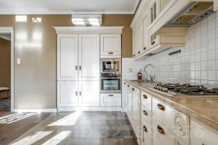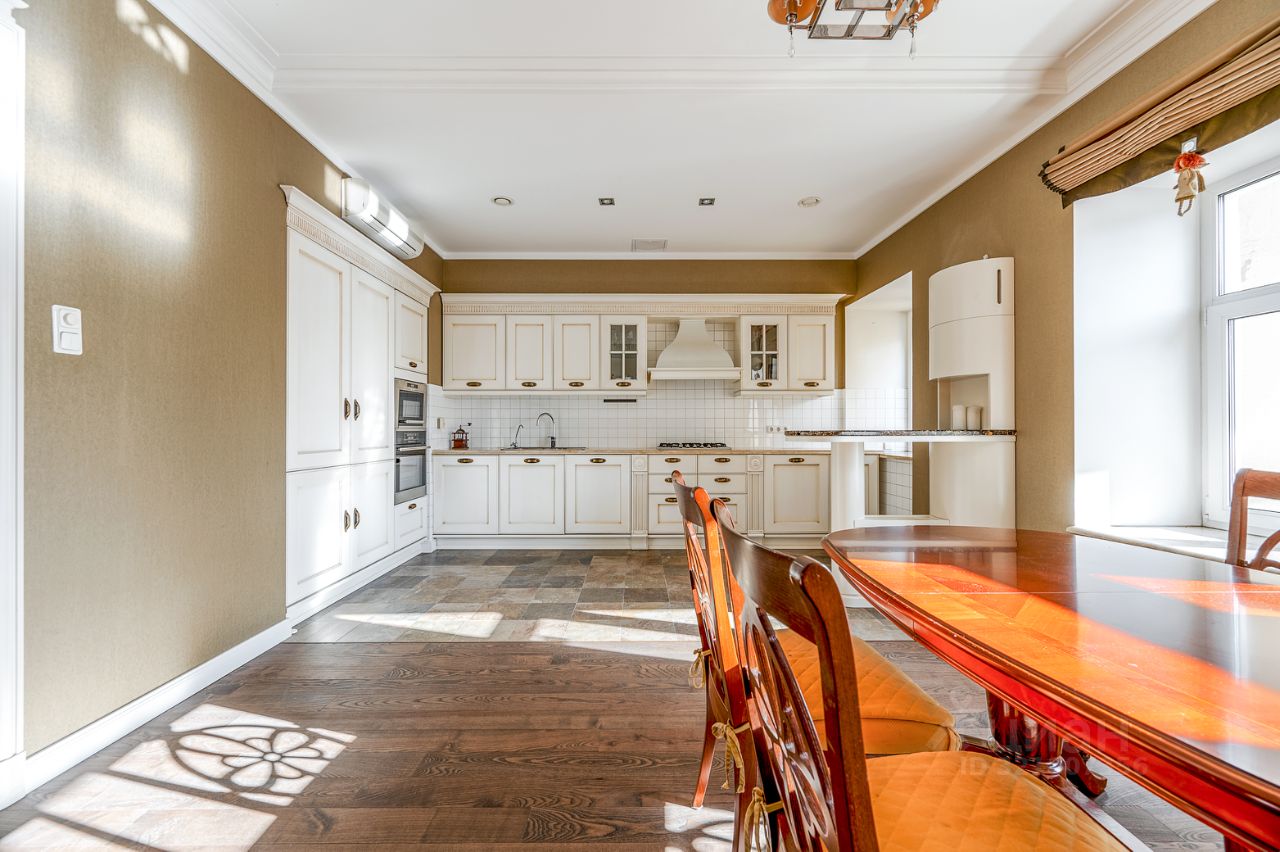 Кухонный гарнитур итальянского бренда Aster Cucine выполненный по индивидуальному проекту и оборудованный немецкой техникой фирмы Kuppersbusch. Все предметы наполнения квартиры (мебель, декор, освещение, входные и межкомнатные двери) выполнены на заказ и привезены из Италии.