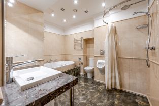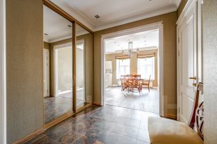 В отделке использованы только самые качественные европейские материалы. В зоне жилых комнат на полу уложена массивная доска из ясеня, в зоне кухни, коридора и санузла - мрамор с системой тёплый пол. Установлен кондиционер.