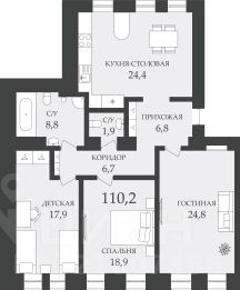 Просторная кухня-столовая 24,4 кв.м., три изолированные комнаты правильной формы (24,8+18,9+17,9), два санузла в одном из которых установлена большая ванна с гидромассажем.