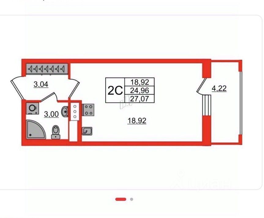 Комната 18.92 кв. м. , прихожая 3.04 кв. м. , санузел 3 кв. м.,