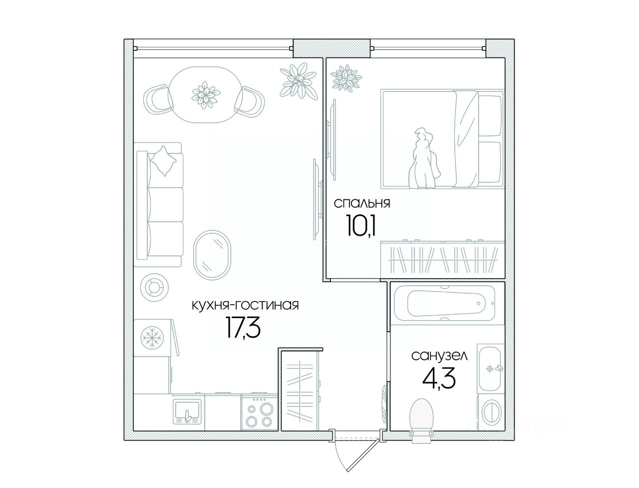 Квартира с кухней-гостиной и спальней. Высота потолков - 4,35 м - возможность обустроить полноценный второй уровень, увеличив полезную площадь.