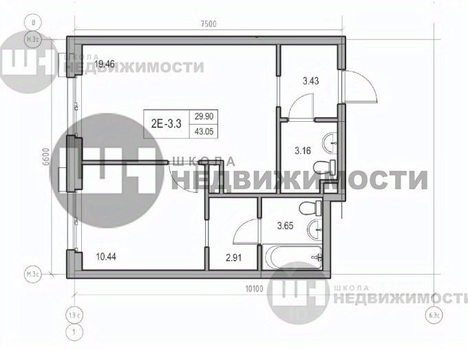Общая площадь 43.05 метра.