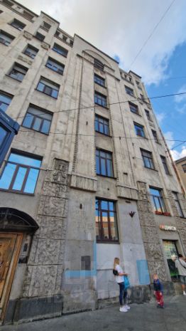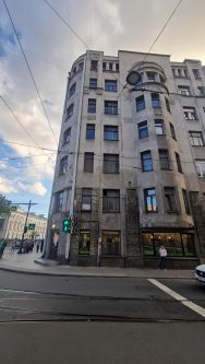 Угловой дом на Лиговском проспекте с фасадом в стиле "Модерн" был построен по заказу доктора медицинских наук Аркадия Львовича Сагалова, видного деятеля начала 20 века. Проектировщиком был архитектор Александр Львович Лишневский, построивший более 20 известнейших и значимых домов, школ, училищ и больниц в дореволюционный период и советское время. Строительство происходило в период с 1913 по 1914 годы. Дом имеет важное значение в истории города и несет в себе дух модернистов той эпохи. Фасад угловой части здания на уровне первого этажа рустован и украшен штукатуркой "под дикий камень". Имеются разные вставки, множество пилястр и тематические изображения мужчин и женщин.