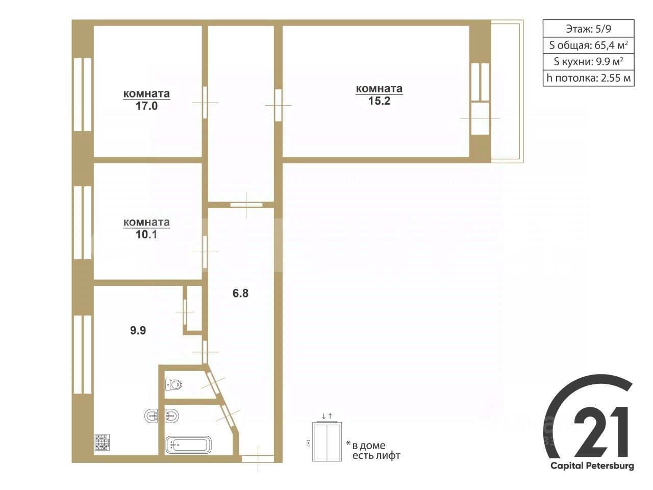 Три изолированные комнаты — 10, 17 и 15 метров, идеально для семьи с детьми;