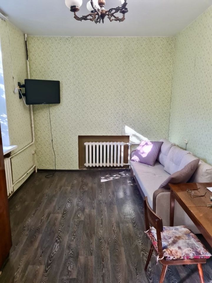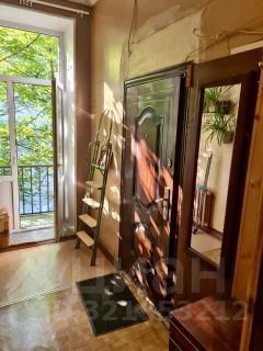 Большая светлая угловая комната в бывшем общежитии коридорного типа. 2 больших окна выходят на тихую зеленую улицу. Потолки 3,2 м.