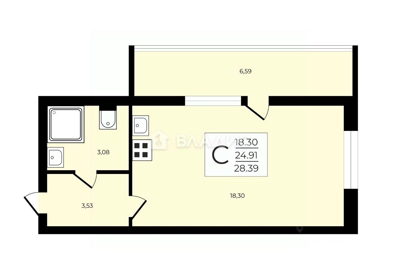 -Общая площадь квартиры 28,39 м², жилая 18,3 м² , балкон 6,59 м²;