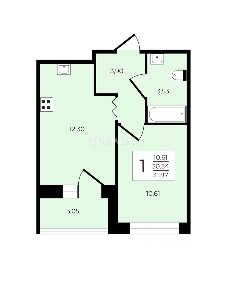 Общая площадь квартиры — 31,9 кв. м, жилая — 10,6 кв. м, кухня — 12,3 кв. м. Высота потолков 2,7 м создаёт ощущение простора. Квартира на втором этаже девятиэтажного дома, угловая, с окнами на улицу. Есть балкон — отличное место для отдыха.