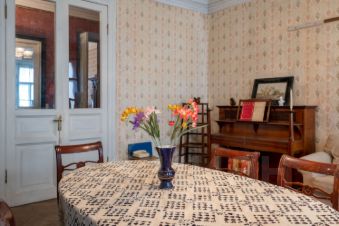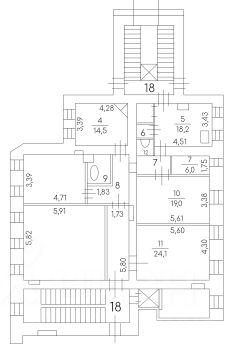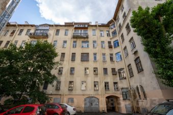 Надежный кирпичный дом 1900 года постройки, перекрытия смешанные. Вход в парадную находится в первом внутреннем дворе, все окна выходят во внутренние дворы, в квартире максимально тихо  шума от дороги совсем не слышно. Квартира двухсторонняя, возможно ее разделение на 2 отдельные квартиры (мокрых точек достаточно), 2 входа в квартиру. Высота потолков 3,23 метра. Установлен пассажирский лифт.