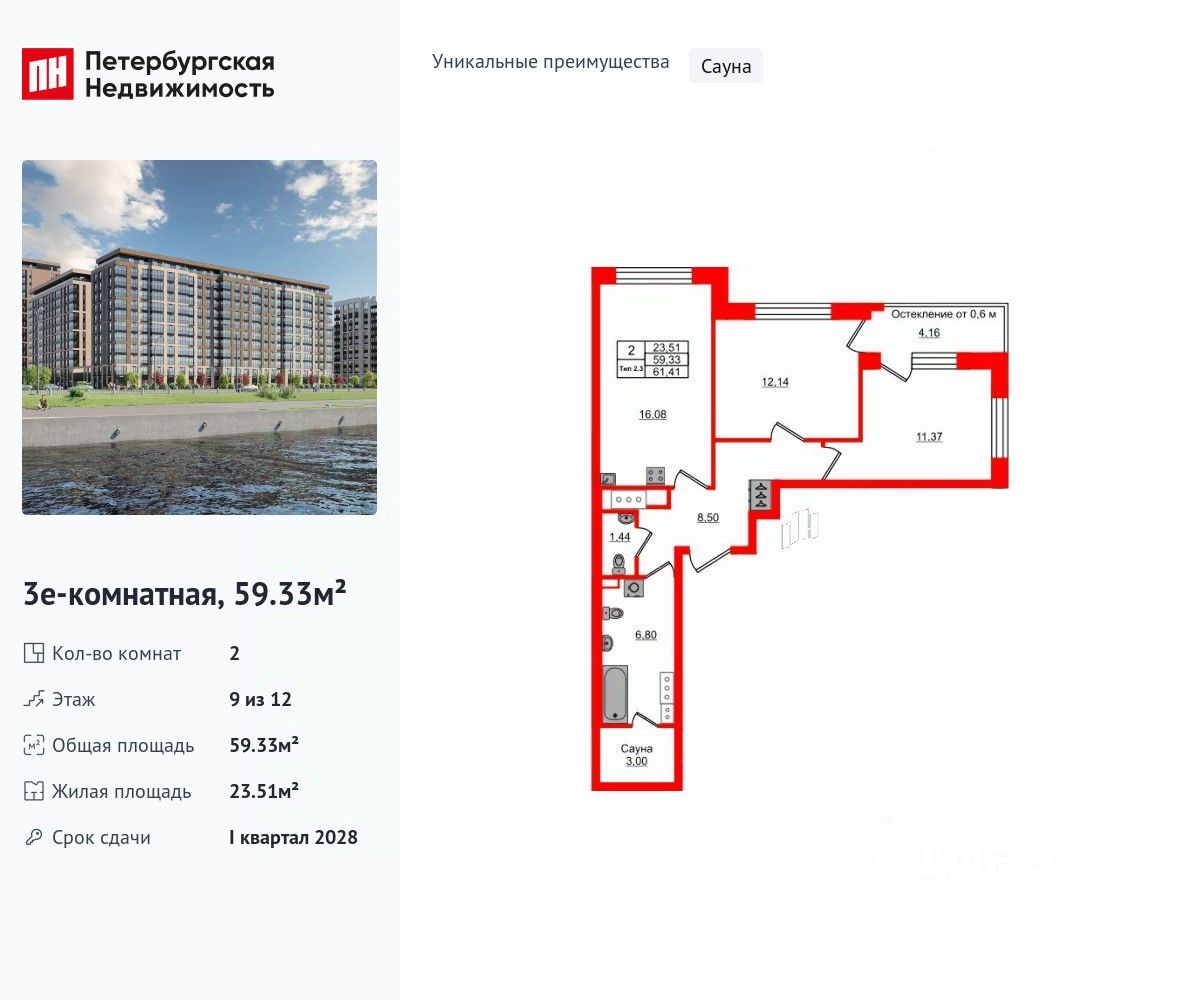 Уникальная, функциональная европланировка, большая кухня-гостиная 16.08 м², просторная прихожая 8.5 м². Общая площадь квартиры - 59.33 м², жилая 23.51 м², высота потолка 2.77 м.