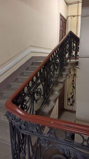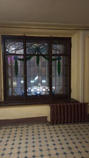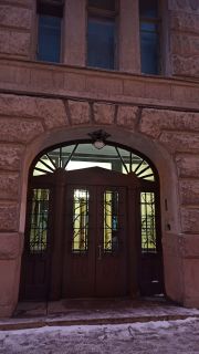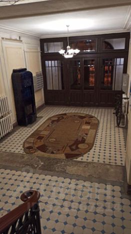 Парадный вход со стороны ул. Бородинская. Реставрированная парадная: оригинальная входная дверь с витражами, изразцовая печь ультрамаринового цвета, витражные окна, широкая лестница, наличие лифта.