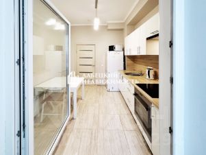 Кухня с панорамной дверью, с выходом на просторную остекленную лоджию.