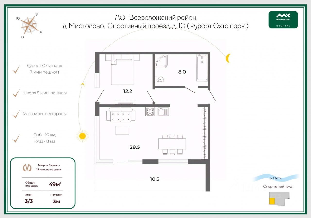 Арт. 115995280 Не пропустите! В продаже редкое предложение - апартамент 49 кв. м с самой востребованной планировкой, расположенный на последнем 3 этаже, в малоэтажном комплексе - "Спортивная деревня". Поселок входит в состав уникального проекта курорта "ОХТА ПАРК" - "Образ жизни". Статусные соседи, однородное окружение! В продаже осталось минимальное количество объектов!