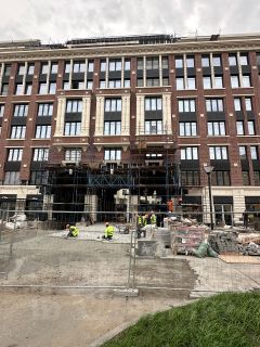 Во дворе также есть амфитеатр с широкими деревянными ступенями.