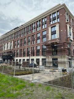 Внутренний двор утопает в зелени, есть зона отдыха с деревянными шезлонгами, место для встреч в тени деревьев, в зоне отдыха установлены уличные обогреватели и дополнительные розетки.