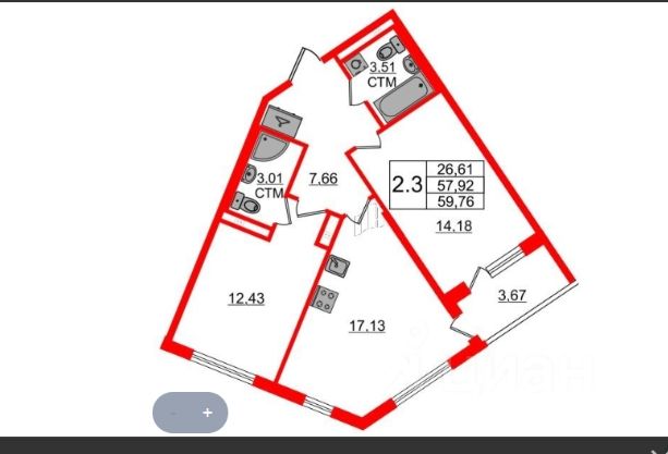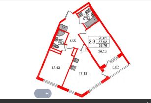 Просторная кухня-гостиная (17,13) и две изолированные комнаты (14,18 и 12,43)— идеальное решение для семьи. Два совмещенных санузла (с ванной и душевой) для вашего удобства, лоджия (3,67) с французским остеклением (от потолка до пола).