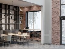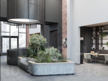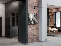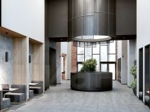 Единая дизайн-концепция продолжается в лобби дома. Сочетание тёплого кирпича с холодным металлом и стеклом создаёт харизматичное, брутальное настроение интерьера парадной группы. Чёткость вертикальных объёмов смягчается округлыми формами стойки ресепшн и декоративных куртин, а большие витражные окна создают иллюзию бесконечности пространства.