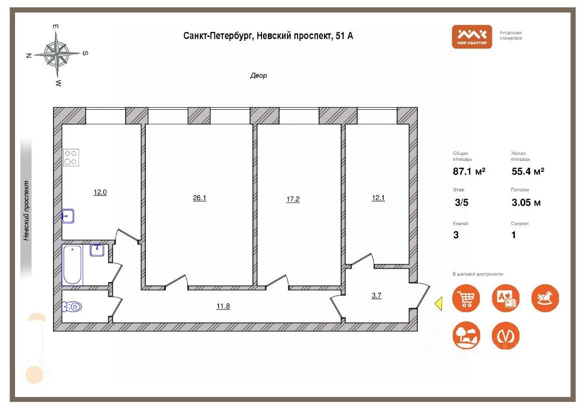 Квартира общей площадью 87,1 кв м абсолютно тихая с окнами в большой светлый первый двор расположена на 3 этаже из 5.