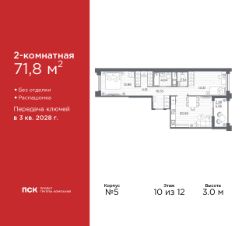 Просторная двухкомнатная квартира в Клубный квартал "Ассамблея" на 10 этаже. Квартира без отделки, новый собственник может сделать ремонт по индивидуальному дизайн-проекту. Общая площадь: 71.8 кв.м., жилая: 27.27 кв.м., площадь просторной кухни-столовой: 20.5 кв.м. Квартира - распашонка, без проходных комнат, окна выходят на paзные стороны дома. В квартире одна лоджия, один совмещенный и один раздельный санузел. Высота потолков 3.0 м.