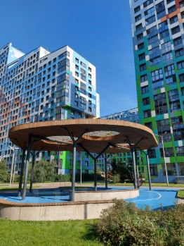 Большой , красивый двор без машин! Много спортивных сооружений, детские площадки, места для отдыха, концертов, выступленй, собраний, ухоженные газоны с гортензиями, детский садик, за пределами ЖК на первых этаж коммерческие помещения, там магазины, аптеки итд