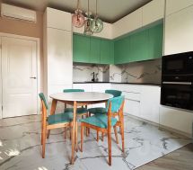 На кухне все организовано максимально удобно, эстетично и современно. Для новых собственников, помимо отличного гарнитура со столешницей из искусственного камня (кварц), при необходимости может быть оставлена и хорошая бытовая техника - встроенные посудомойка Bosch, индукционная варочная панель и духовой шкаф Hotpoint Ariston, микроволновка и холодильник Samsung, а также кондиционер.