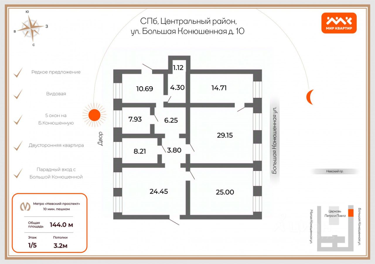 Квартира располагается в центре золотого треугольника Санкт-Петербурга на улице Большая Конюшенная.