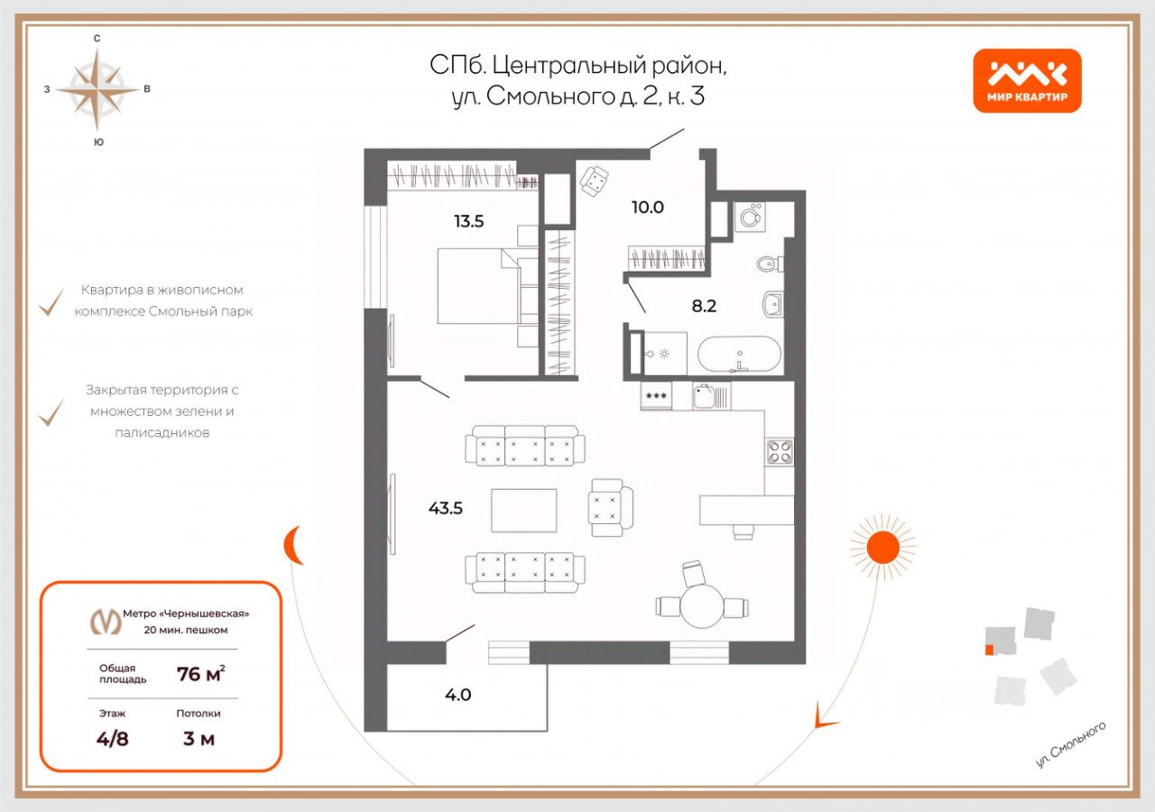 Арт. 116956752 Квартира с дизайнерским ремонтом т видом на Смольный Собор в ЖК Смольный Парк (фото интерьеров по запросу!)