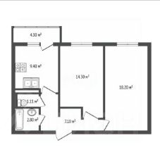 Общая площадь 52,9 квадратных метров: 2 спальни 18,2 и 14,3 квадратных метров, кухня 9,4 квадратных метров