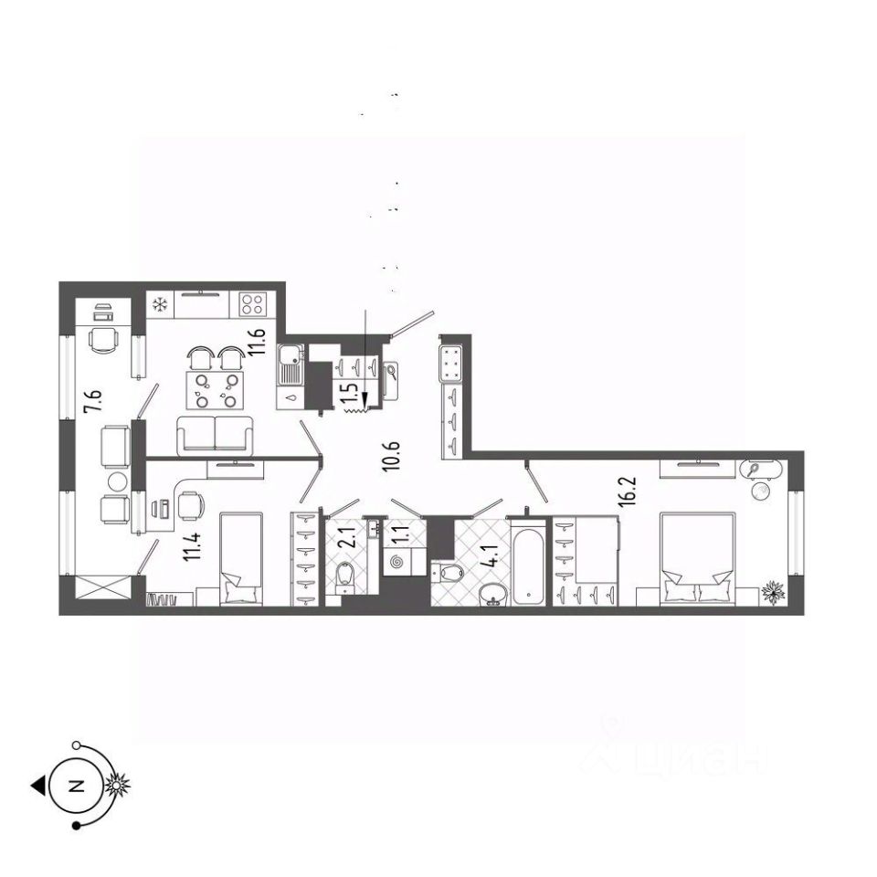 - Комната 16.2м2+11,4м2